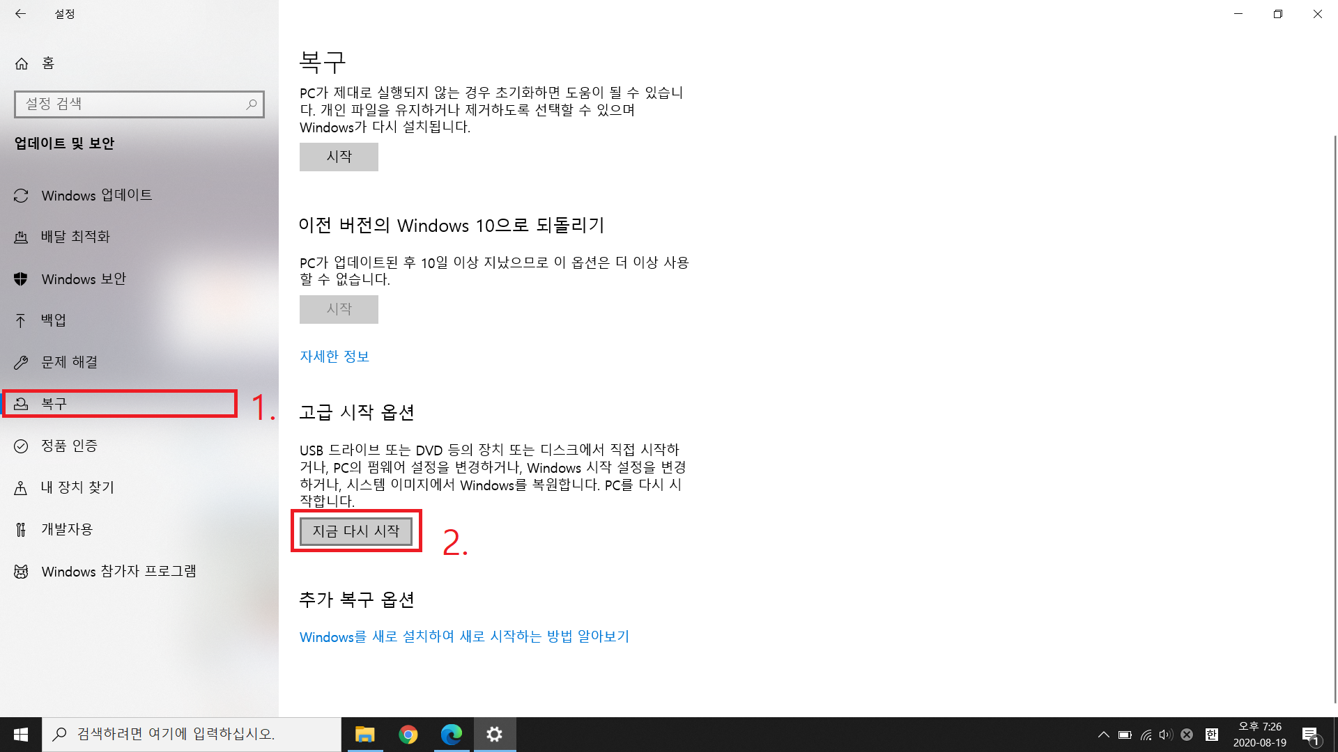 - 왼쪽의 복구 탭을 선택 후 고급 시작 옵션에서 지금 다시 시작 버튼을 누른다. 다음 차례 부터는 스크린샷을 찍을 수 없어 카메라 사진으로 대체한다.