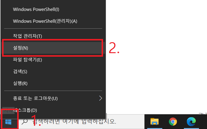 - 바이오스를 켜야한다. 화면 왼쪽 하단의 윈도우 아이콘에서 마우스 오른쪽 버튼을 누른 후 설정으로 들어간다.