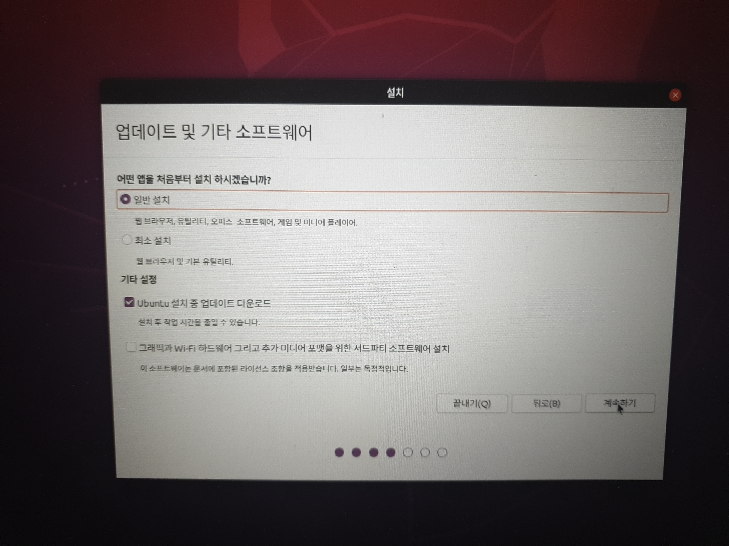 - 업데이트 및 기타 소프트웨어 설치 탭에서는 다음 사진과 같이 설정 후 "계속하기" 버튼으로 넘어갔다. 필요하다면 다른 설정을 이용한다.