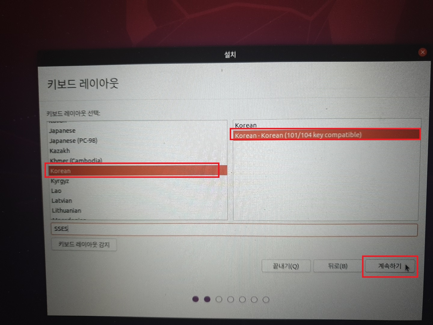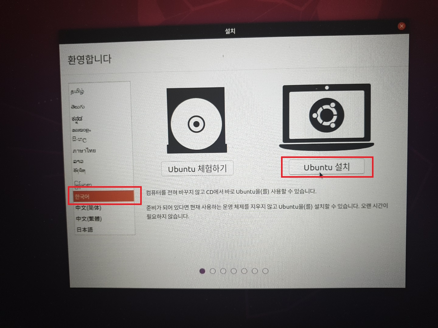 - 로딩을 기다리면 후에 언어 설정화면이 나온다. 좌측에서 원하는 언어를 설정한다. 필자는 한국어를 선택하였다. 그 후 Ubuntu 설치 버튼을 클릭한다.