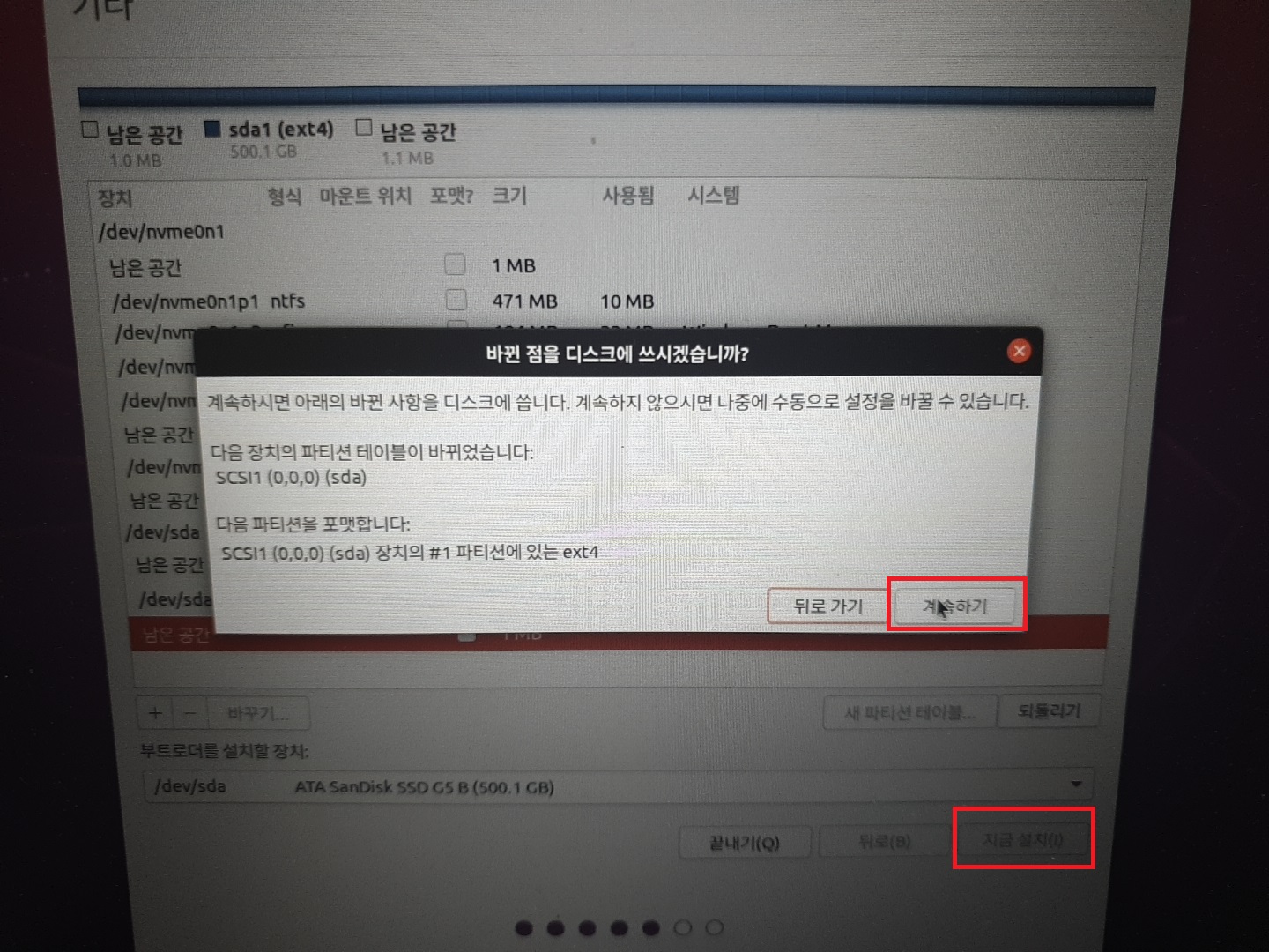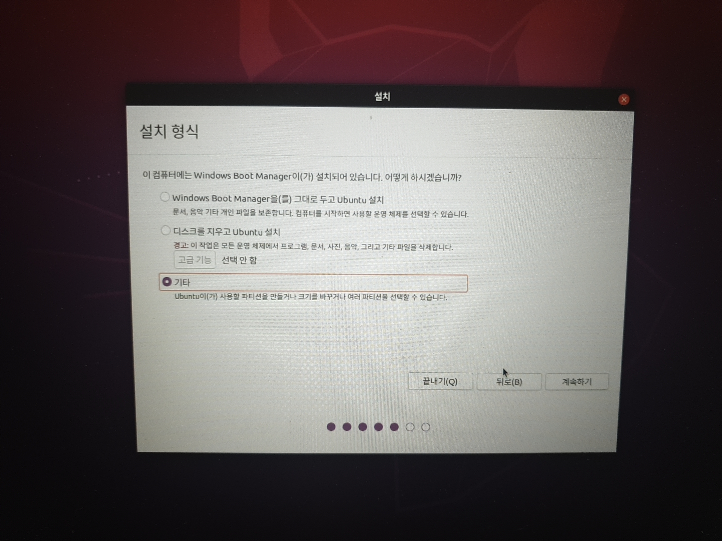- 필자는 듀얼부팅이 목적이기에 기타 옵션을 선택하였다. 혹여 원도우 os를 밀어버리고 우분투를 이용하고 싶다면 다른 옵션을 선택하여 이용한다. "계속하기" 버튼을 눌러 다음 화면으로 이동한다.