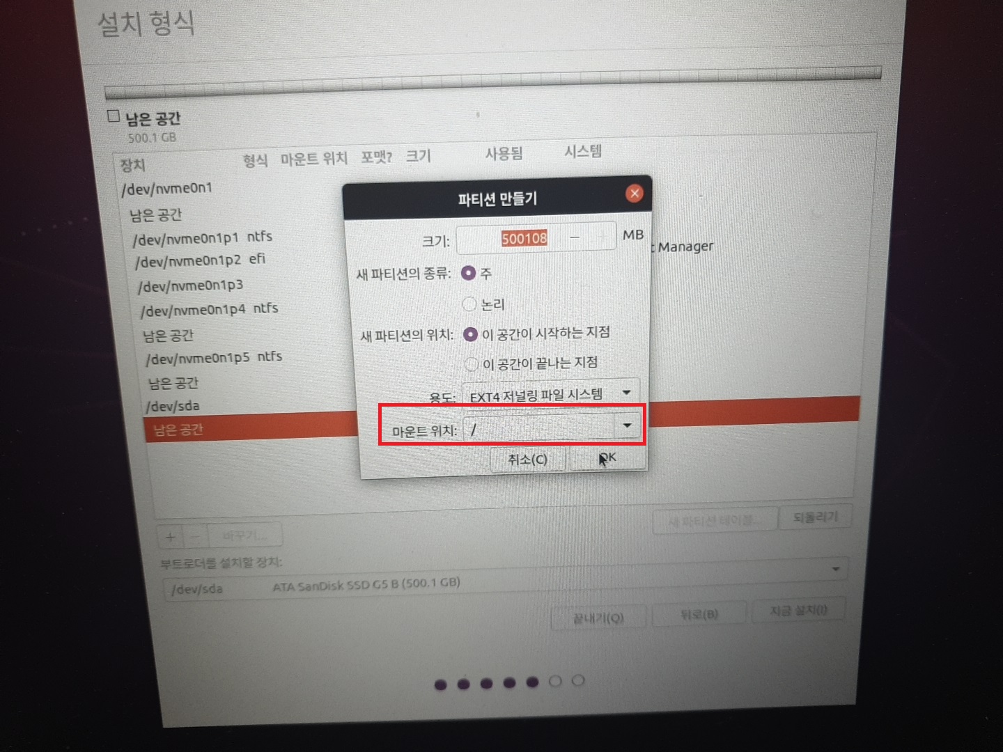 - 과정 20.의 '사진 내의 2.'를 더블클릭하여 다음과 같은 창을 띄운다. 필자는 파티션을 나누지 않을 것이기에 크기는 따로 설정하지 않았다. "마운트 위치"를 사진과 같이 설정 후 OK버튼을 누른다.