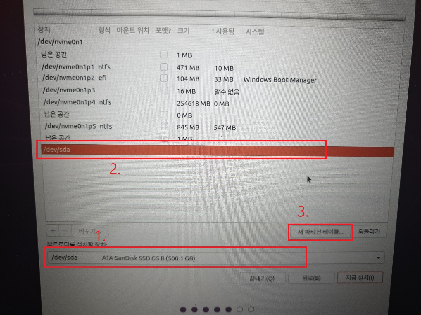 - 하단에 부트로더를 설치할 장소를 새로 장착한 디스크로 바꿔준다. (사진 내의 1.) 해당 항목의 앞 부분에 `/dev/sda`로 나와있으며, 이는 '사진 내의 2.' 와 동일하다. 동일하게 '사진 내의 2.'를 선택해주고 새 파티션 테이블 버튼을 누른다.