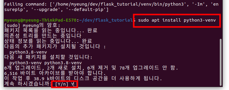 - venv 모듈을 설치하기 위해 사진과 같은 커맨드를 입력하였다. "계속 하시겠습니까? [Y/n]"에서 Y를 입력후 엔터를 입력한다.