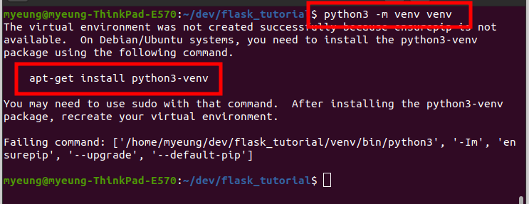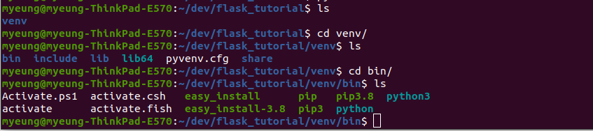 python3 -m venv venv커맨드 한번으로는 파일이 제대로 생성되지 않아 "~/dev/flask_tutorial"에서 동일한 커맨드를 한번 더 입력하였다.