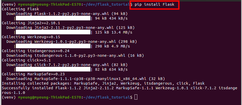 - 가상환경이 적용된 상태에서 사진의 커맨드를 입력하면 flask가 정상적으로 설치된다.