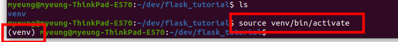 - 다시 "~/dev/flask_tutorial" 디렉토리로 돌아와서 다음과 같은 커맨드를 입력한다. 커맨드 입력 후 엔터를 누르면 다음 줄의 시작부분에 "(venv)"라는 표시가 나오는데, 이것이 가상환경이 적용되었다는 표시이다.