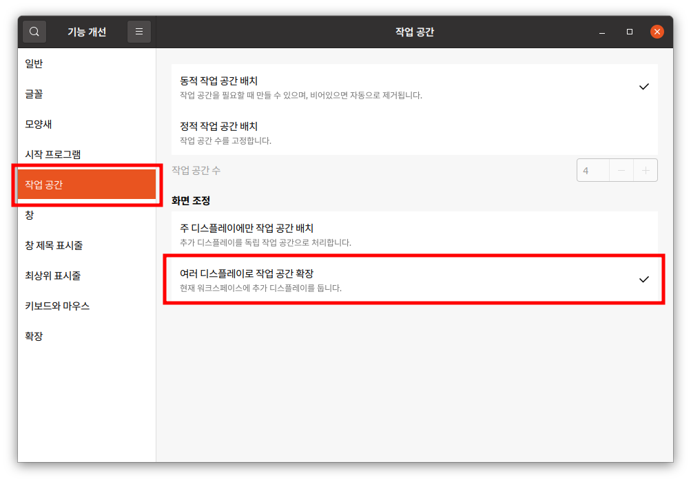 $ gnome-tweaks - 아래의 화면이 나오면 작업공간(workspace)에 들어가 "여러 디스플레이로 작업 공간 확장"을 선택한다.
